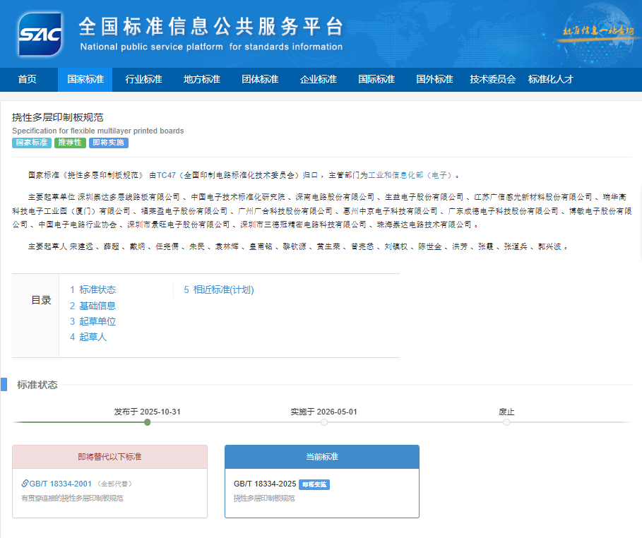 2023年,福莱盈电子股份有限公司深度参与国家标准《GB/T 18334—2025 挠性多层印制板规范》核心条款论证与文本的起草工作。 近日(2025年10月31日),该标准经国家标准化管理委员会审核正式通过并发布,将于2026年5月1日起实施。 此标准的发布夯实了印制电路板标准建设基础,公司将持续以标准引领技术创新,助力行业高质量发展。